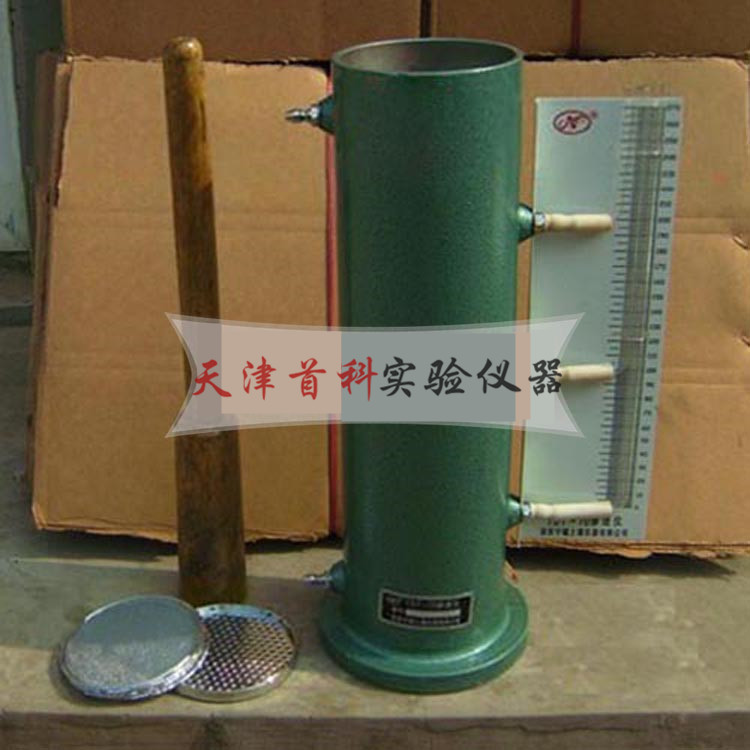 本儀器主要由滲水部件和擊實(shí)部分組成。滲水部件由筒身、滲水板、刻度板、測壓管等組成,在刻度板上裝有三個(gè)測壓管,其間距為100±0.44mm,水位的測讀可由安裝在筒上的刻度板的刻度讀出,測壓管接頭內(nèi)均裝有銅絲布以防止細(xì)砂粒在試驗(yàn)時(shí)隨水流出。滲水筒下部有一排水孔,松開螺栓即可放出污水。擊實(shí)部分備有木錘,以擊實(shí)試樣。